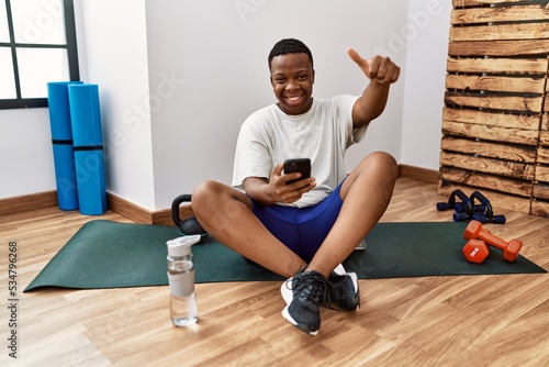 Young african man sitting on training mat at the gym using smartphone approving doing positive gesture with hand, thumbs up smiling and happy for success. winner gesture.
