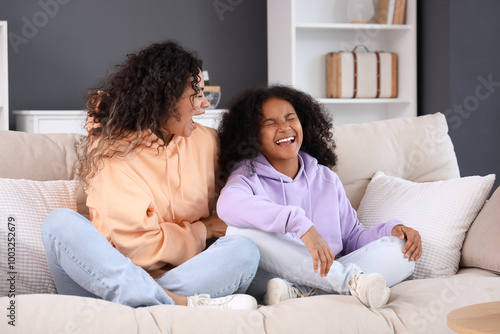 Young African-American woman with her daughter sitting on sofa and laughing at home
