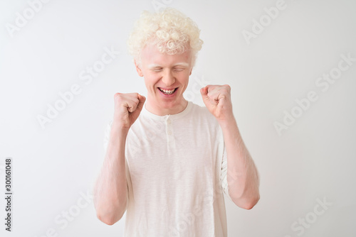 Young albino blond man wearing casual t-shirt standing over isolated white background excited for success with arms raised and eyes closed celebrating victory smiling. Winner concept.