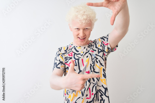 Young albino blond man wearing colorful t-shirt standing over isolated white background smiling making frame with hands and fingers with happy face. Creativity and photography concept.