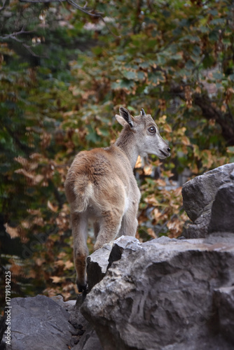 Young alpine goat kid climbing the rocks