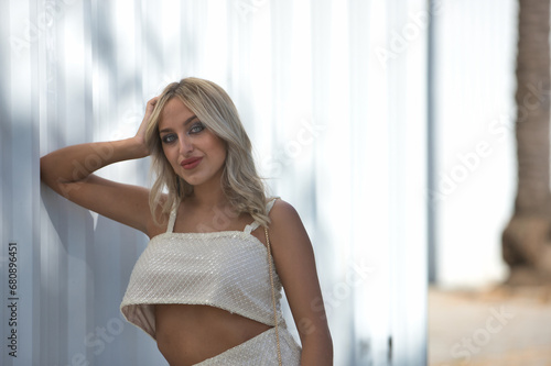 Young and beautiful woman, blonde with blue eyes and wearing a white sequined dress, leaning against a white sheet metal wall, in a flirtatious and sensual attitude. Concept beauty, fashion, flirting.