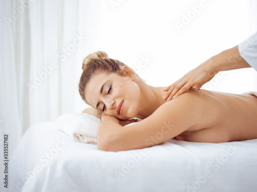 Young and blonde woman enjoying massage of back in spa salon. Beauty concept