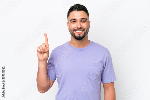 Young Arab handsome man isolated on white background pointing up a great idea