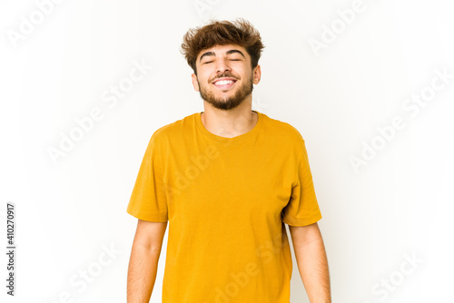 Young arab man on white background laughs and closes eyes, feels relaxed and happy.