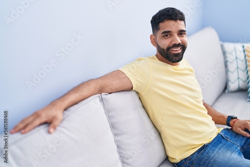 Young arab man smiling confident sitting on sofa at home