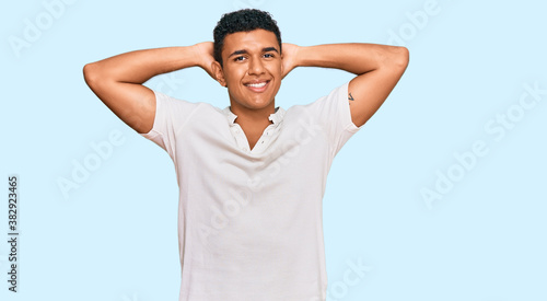 Young arab man wearing casual clothes relaxing and stretching, arms and hands behind head and neck smiling happy