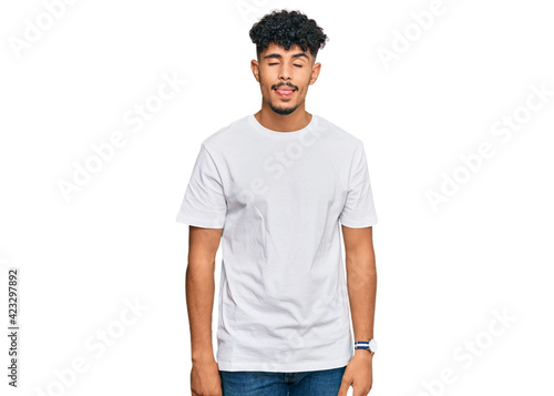 Young arab man wearing casual white t shirt sticking tongue out happy with funny expression. emotion concept.