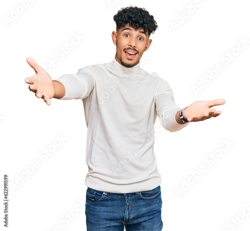 Young arab man wearing casual winter sweater looking at the camera smiling with open arms for hug. cheerful expression embracing happiness.