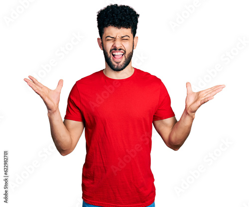 Young arab man with beard wearing casual red t shirt celebrating mad and crazy for success with arms raised and closed eyes screaming excited. winner concept