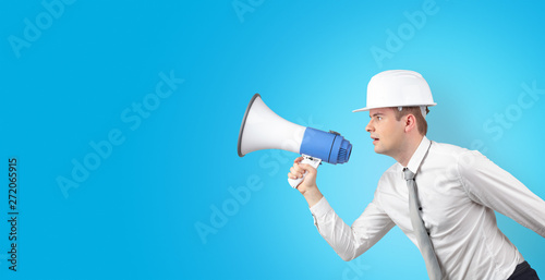 Young architect constructor yelling with megaphone and copyspace