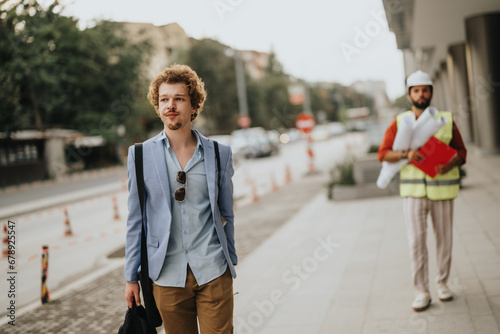 Young architects and engineers collaborating on project design and site supervision at an urban construction site. Their teamwork ensures successful sustainable development with advanced technology.