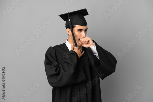 Young Argentinian university graduate isolated on grey background is suffering with cough and feeling bad