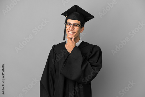 Young Argentinian university graduate isolated on grey background with glasses and smiling