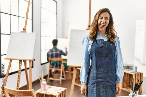 Young artist woman at art studio sticking tongue out happy with funny expression. emotion concept.