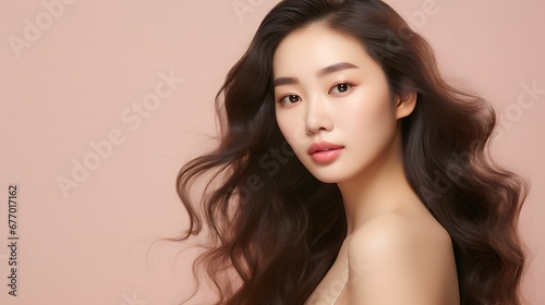 young asain women curly long hair perfect skin show copy space on her hand on isolated beige background
