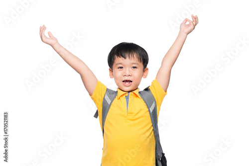 Young asian boy smile gesture hands ready to school