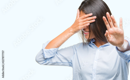 Young asian business woman over isolated background covering eyes with hands and doing stop gesture with sad and fear expression. Embarrassed and negative concept.
