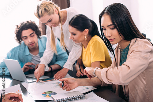 young asian businesswoman looking at wristwatch while her partners working behind at modern office