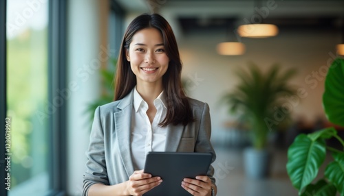 Young Asian businesswoman stands in modern office holding tablet. Pro woman looks happy, confident. Planning working on something. Modern tech office environment with plants. Possible scenario for