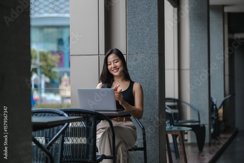 Young Asian businesswoman using laptop having video call sitting in cafe