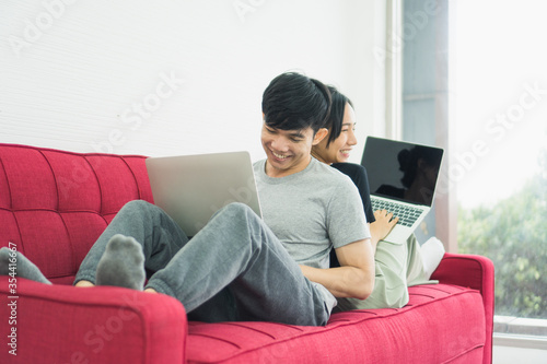 Young Asian couple love man and woman working at home by use computer laptop notebook sitting on red sofa in living room smiling and felling happy. corona virus, COVID-19 Pandemic new normal Concept