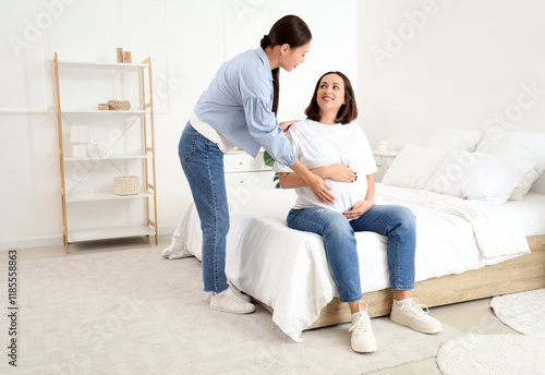 Young Asian doula and pregnant woman sitting in bedroom
