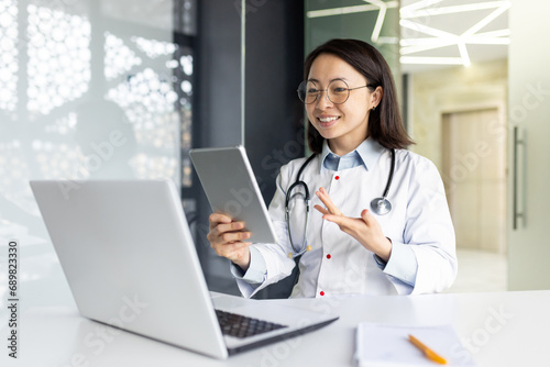 Young Asian female doctor working inside medical office consulting patients remotely, smiling with satisfaction at client, using tablet computer for video call, sitting at desk with laptop.