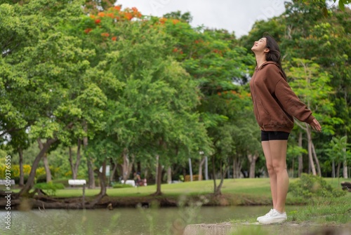 Young asian female lady model in her exercise sweater jacket sitting chillingly and calmly on the green grass while enjoying the calming breeze air and sunbath beside a calm lake in an outdoor park