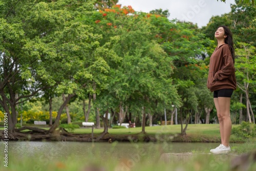 Young asian female lady model in her exercise sweater jacket sitting chillingly and calmly on the green grass while enjoying the calming breeze air and sunbath beside a calm lake in an outdoor park