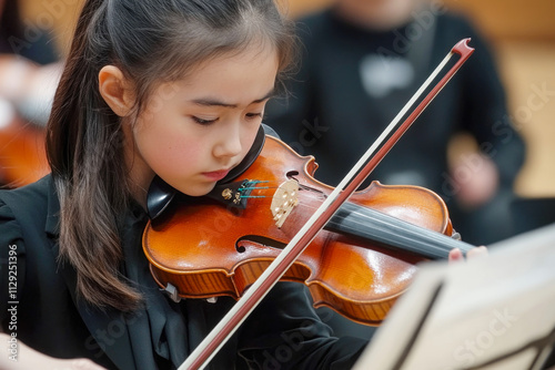 Young asian female violinist in focused performance
