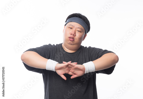 Young Asian funny fat sport man stretching before exercise isolated on white background.