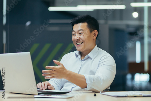 Young Asian male businessman conducts online business meeting, conference. Sitting in the office at the table in front of the laptop and communicating via video call.