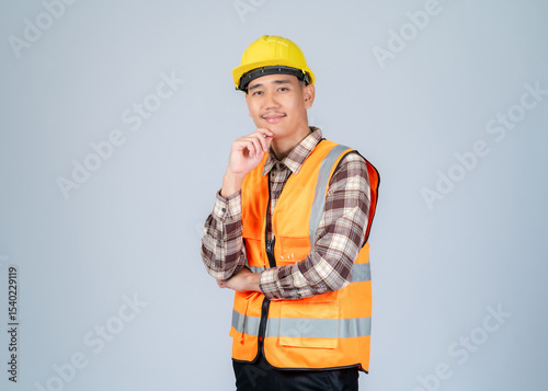 Young Asian male engineer or worker wearing yellow hard hat and reflective vest standing on grey background.