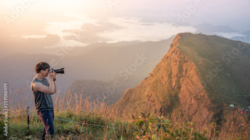 Young Asian male photographer and traveler taking photo of mountain landscape scenery during sunrise at Khao San Nok Wua in Kanchanaburi, Thailand. Travel photography concept