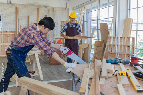 Young asian male worker wearing plaid shirt and blue jean apron with white gloves holding saw cutting wood stick on the table full of building tools and equipments while his colleague stand holding