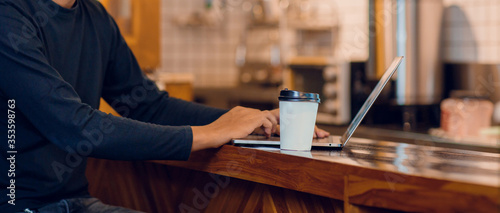 Young asian man drinking coffee in cafe and using laptop computer. Freelancer working from coffee shop
