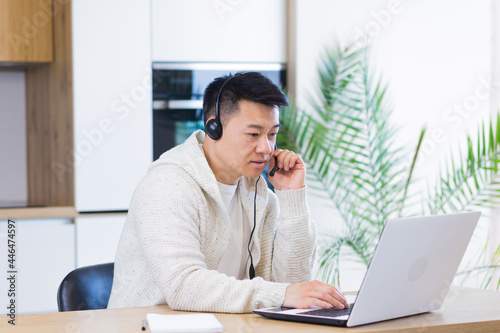 young asian man freelancer sitting at home at office desk with headset and talking online on video link via laptop in room or kitchen. The male indoors in casual clothes does the work and talks