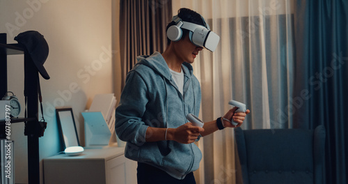 Young Asian man gamer wear gray hoodie with VR oculus hold VR joystick controllers feeling exciting with new experience of game stand front sofa living room home at night. Virtual reality concept.