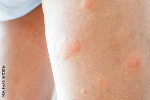 Young asian man has allergic skin rash on his legs from itchy dry skin eczema dermatitis insect bites
