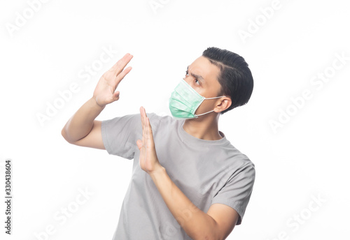 Young Asian Man wearing hygienic mask gesturing stop to prevent infection, 2019-nCoV or coronavirus. Airborne respiratory illness such as pm 2.5 fighting and flu.isolated on white background.