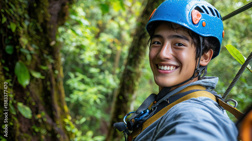 Young Asian Man Ziplining in a Tropical Forest on a Sunny Day