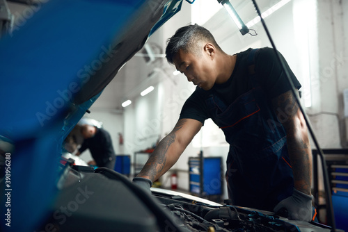 Young asian mechanic working with engine near open hood