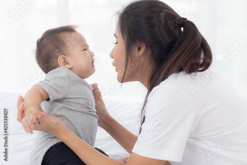 Young asian mother holding little baby girl together in the bedroom at home, mom carry child and care, woman and kid with carefree, toddler and parent, emotion and expression, family concept.