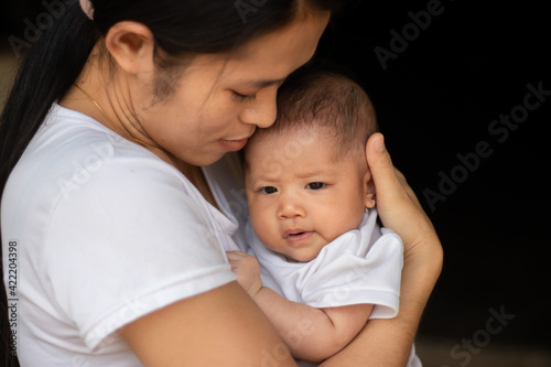 Young Asian mother kissing and holding little daughter in the park, Mother play enjoying with her cute baby girl in outdoor, copy space
