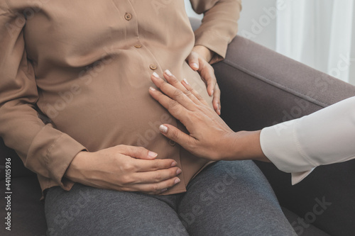 Young asian pregnant woman holding her belly while gynecologist check up the symptoms by touching her abdomen about the pregnancy is explaining about the unborn child.
