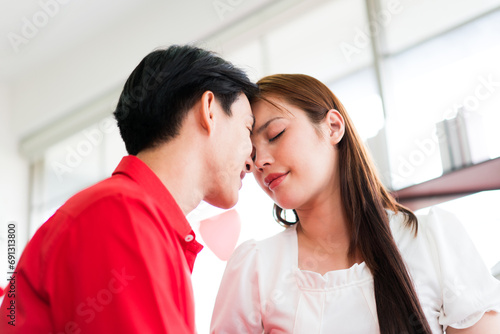 Young Asian romantic happy couple touching foreheads, closing their eyes with smiling enjoying the tender romantic moment and sharing affectionate feelings in living room. Valentine's Day celebration