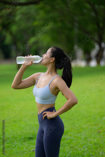Young Asian sportswoman drinking water from plastic bottle after training in park