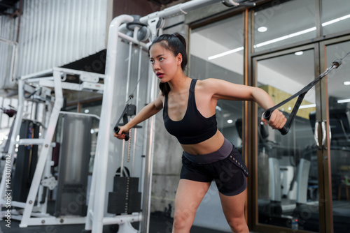 Young asian sportswoman is exercising her chest and shoulders using cable crossover machine, focusing on building muscle strength and maintaining fitness in modern gym environment