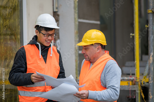Young Asian trainee engineer at work on construction site with the senior manager. Outdoors